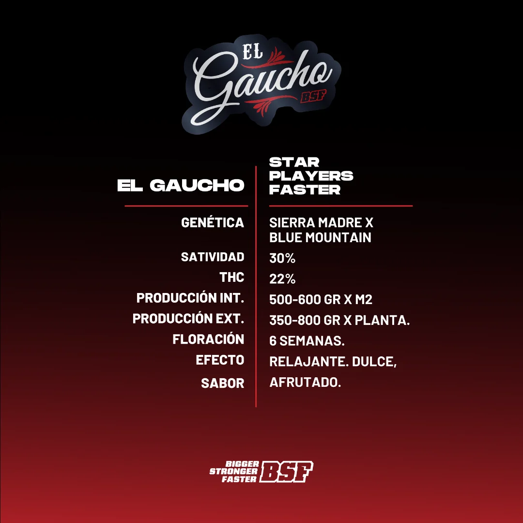 El Gaucho Faster Flowering é o resultado do cruzamento impecável de duas grandes variedades: Sierra Madre x Blue Mountain, obtendo uma genética única, estável e resistente a pragas e fungos; uma verdadeira joia tanto em ambientes internos quanto externos, com grandes colheitas em pouco tempo. Possui um forte efeito relaxante, ideal para aqueles dias tranquilos em casa. Seu sabor é doce e frutado, tornando a nova floração mais rápida da BSF SEEDS um verdadeiro luxo que todos desejarão ter em seus jardins. Genética: Sierra Madre x Blue Mountain