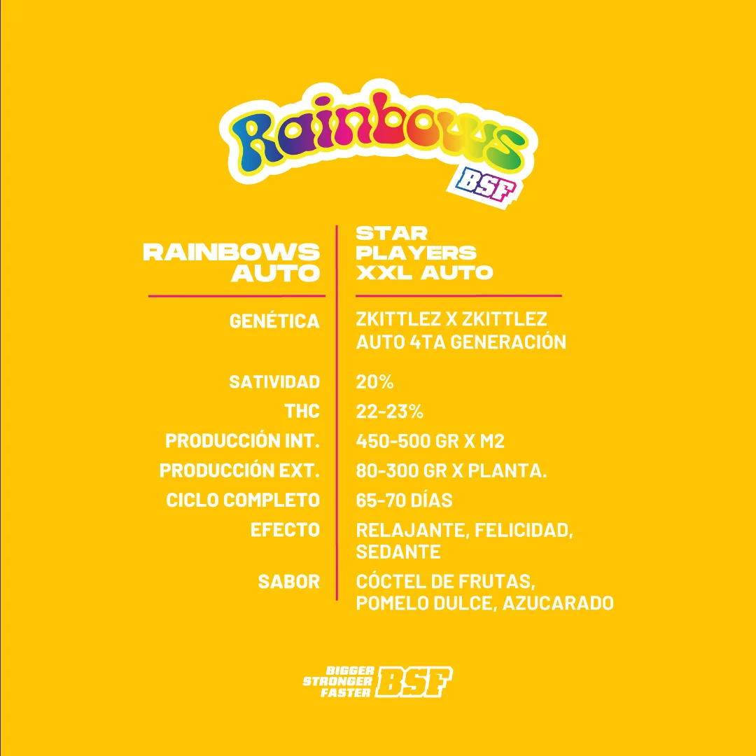 Rainbows XXL Auto foi desenvolvida ao longo de cinco anos e cruzada por quatro gerações para atingir a estabilidade, os terpenos e a produtividade necessários para criar a versão autoflorescente da campeã Rainbows Fem da BSF Seeds.