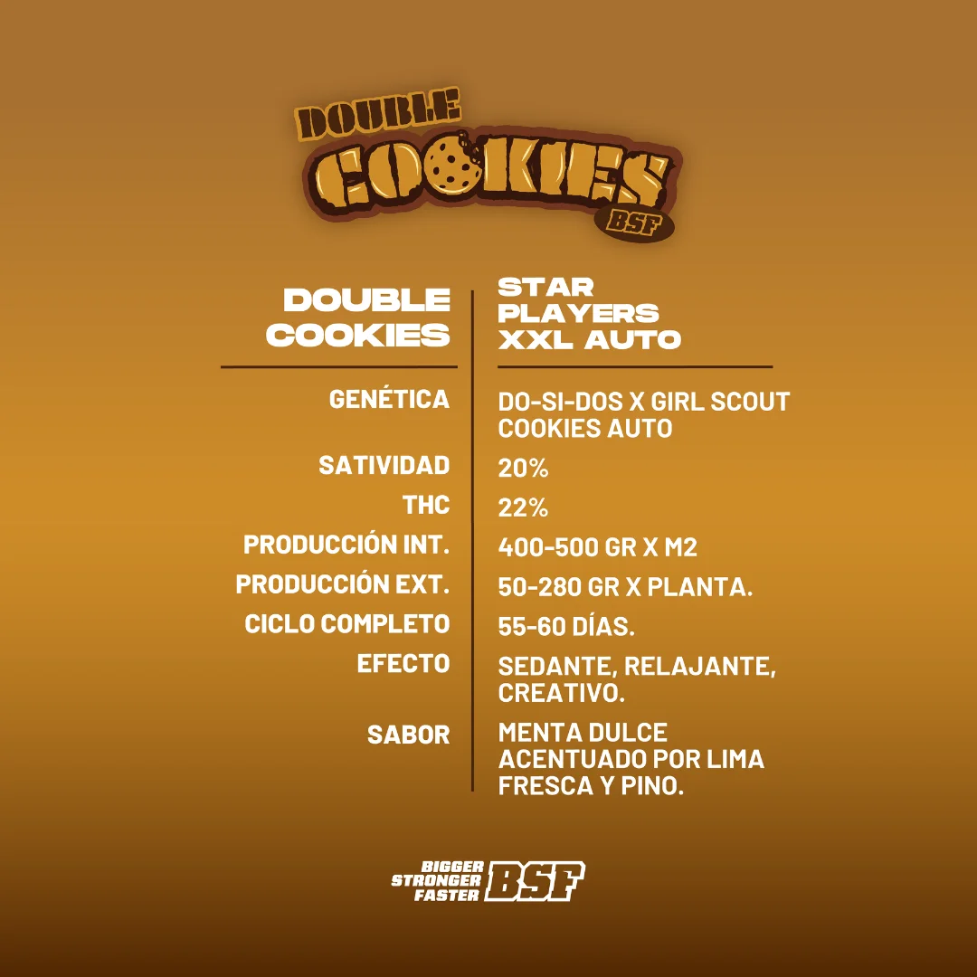 Double Cookies Auto é um híbrido indica/sativa resultante do cruzamento do clone elite da Do-Si-Dos, como mãe, e da quarta geração da Girl Scout Cookies Auto, como pai, permitindo que ela retenha o verdadeiro e procurado sabor da Girl Scout Cookies.